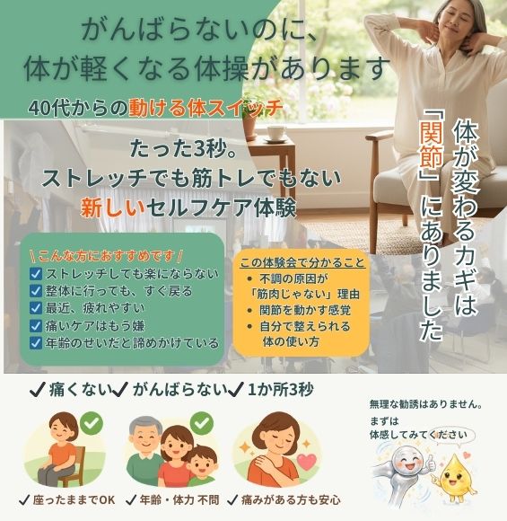 「これだけで本当に変わるの?」と驚かれる方も多く、無理に押したり揉んだり伸ばしたりすることは一切ありません。